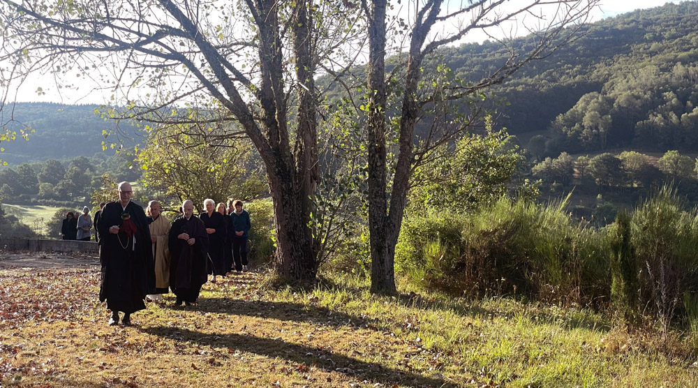 Kin hin is the continuation of zazen while standing. It is practiced between two meditation sessions. This is a walking meditation guided by the breath, where concentration on every detail of posture is essential.